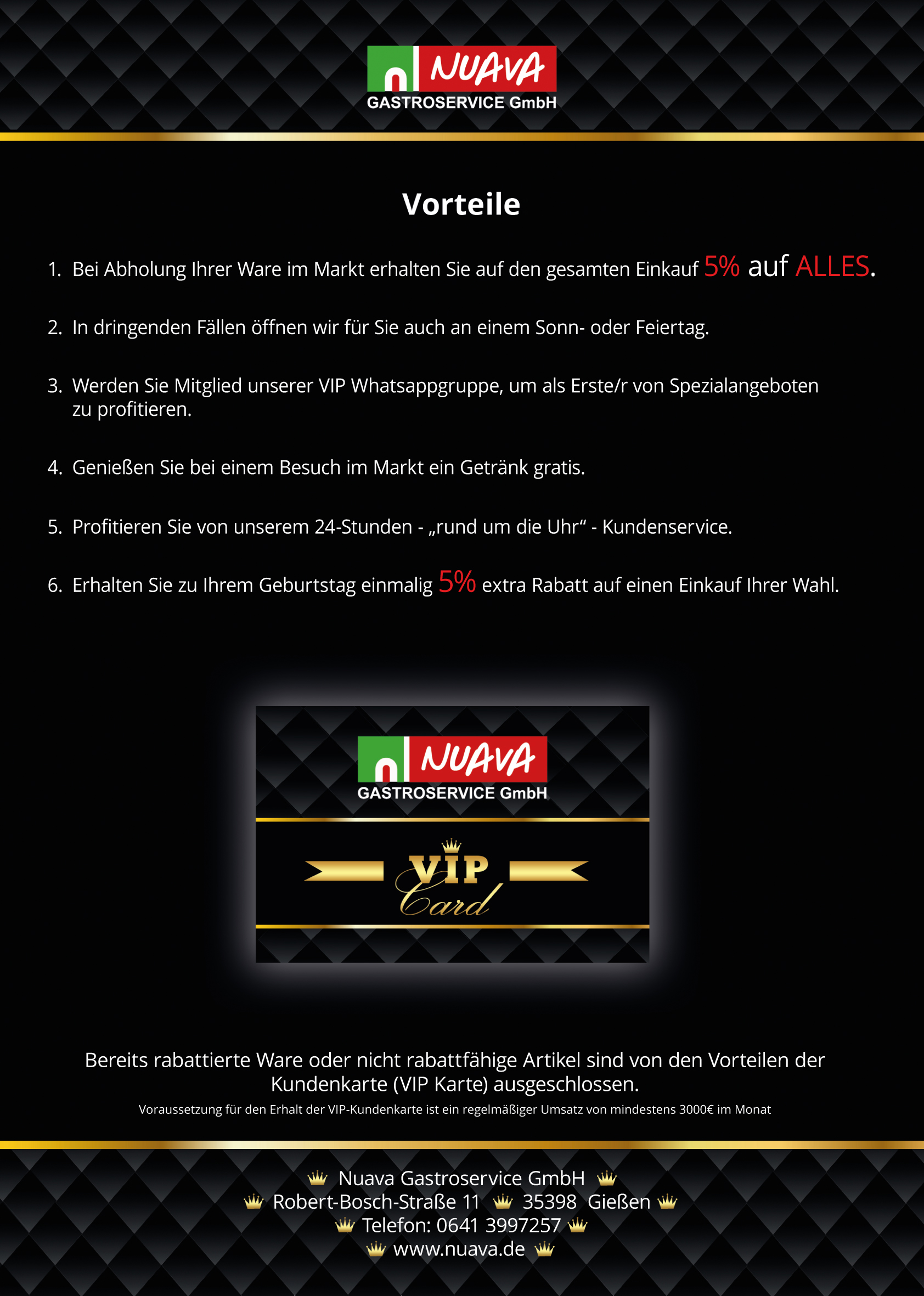 Voraussetzung für den Erhalt der VIP-Kundenkarte ist ein regelmäßiger Umsatz von mindestens 3.000 € im Monat.